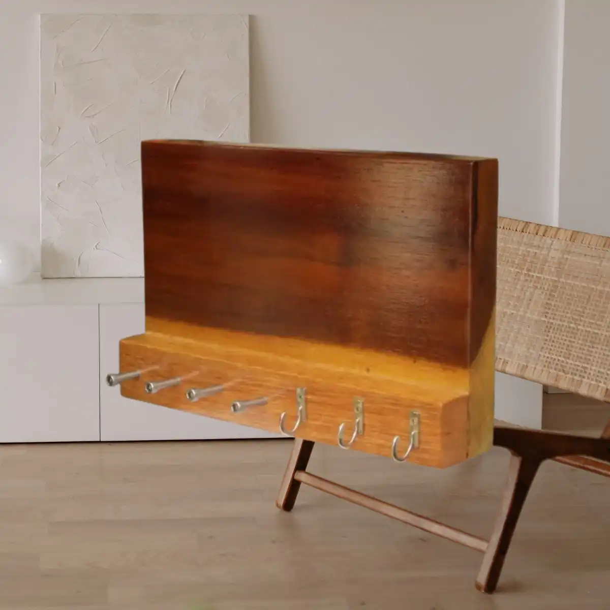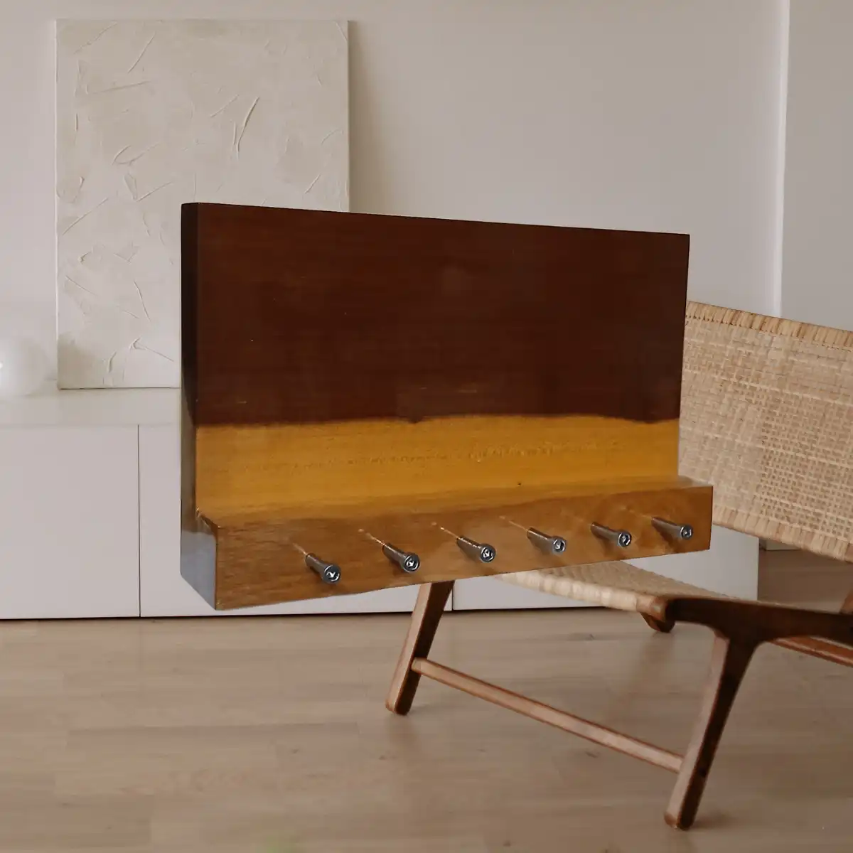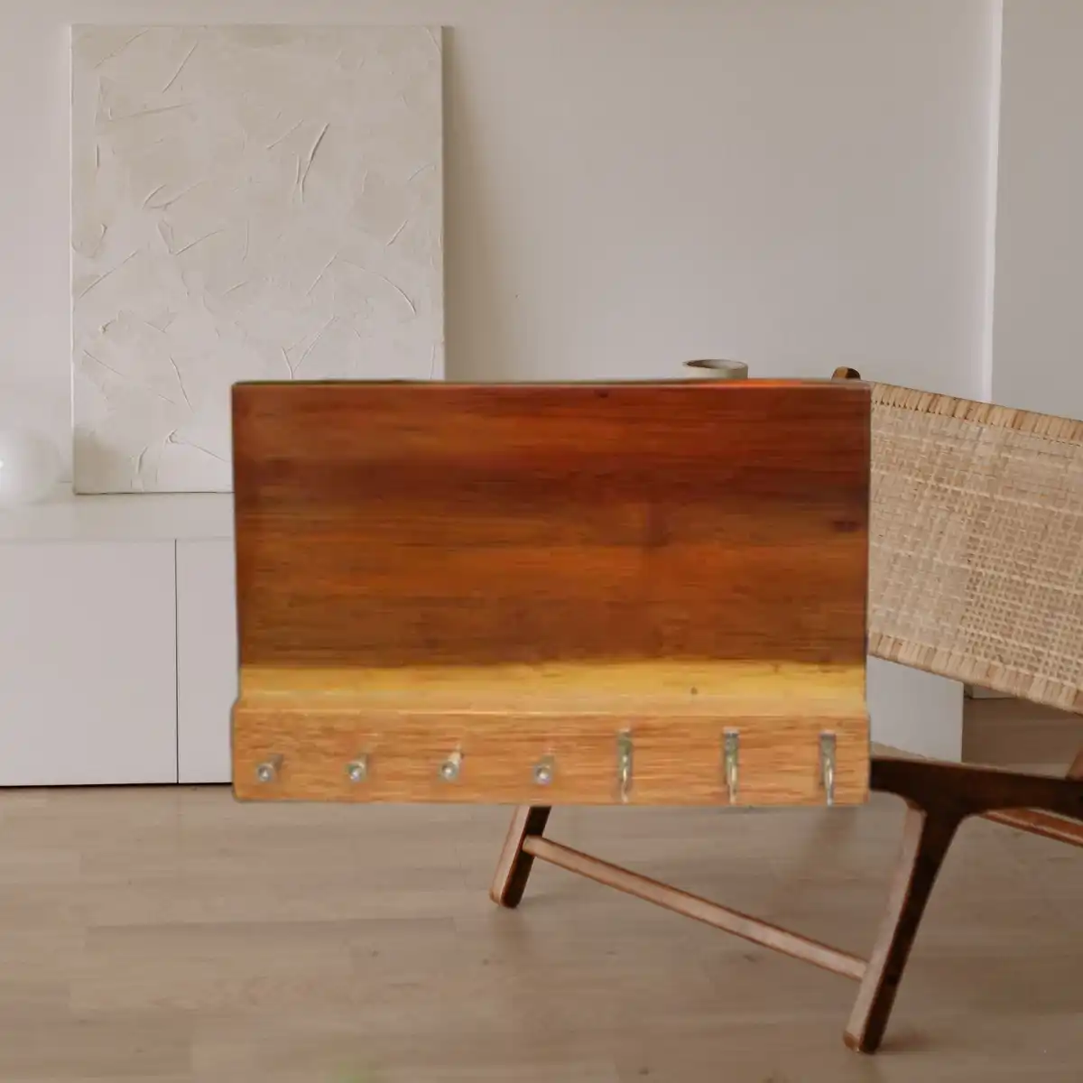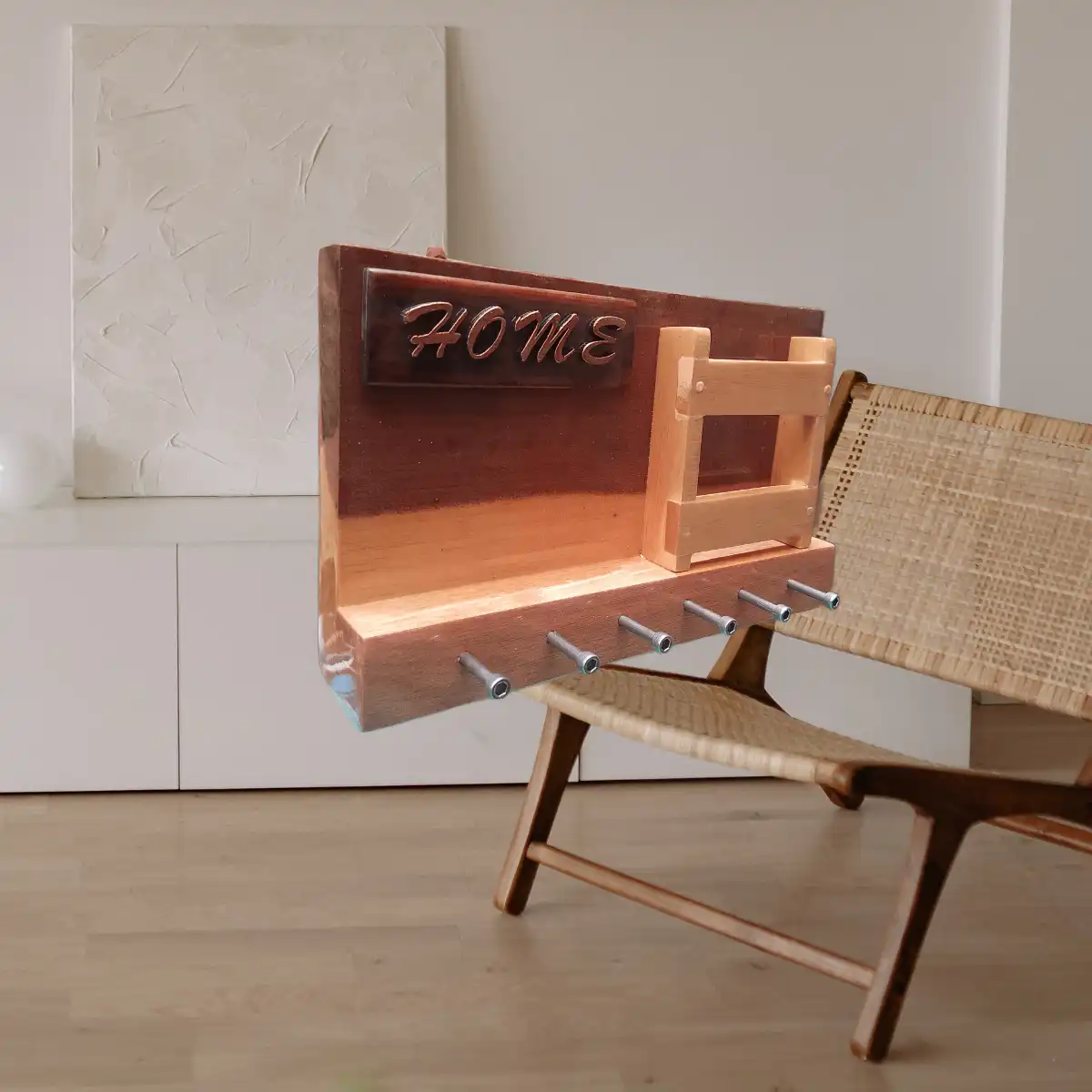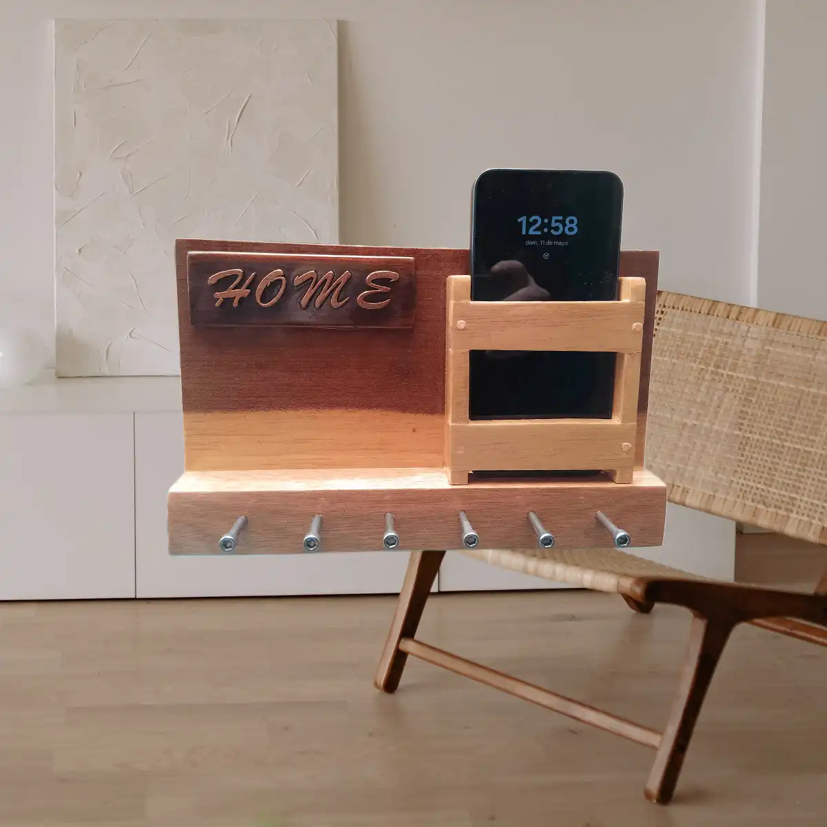 Este porta llaves horizontal de madera natural no solo organiza, también decora. Está diseñado para mantener tus llaves siempre accesibles mientras aporta calidez y estilo a tu hogar. Ideal para la entrada, cocina o pasillo.
