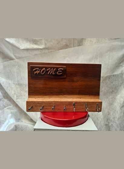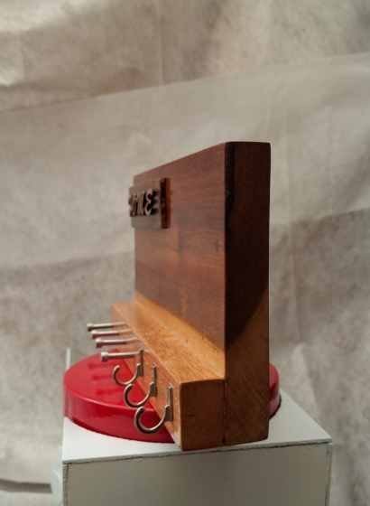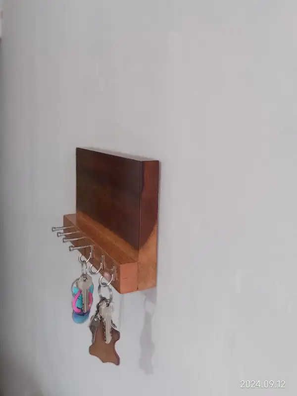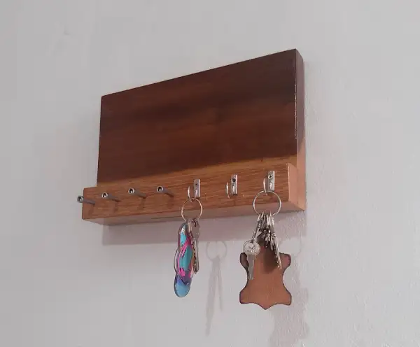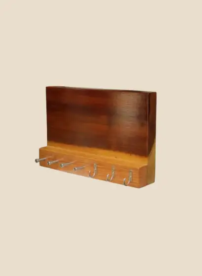 Este organizador de pared combina funcionalidad y estilo, fabricado en madera de banak de alta calidad con un diseño rectangular y elegante. En su parte frontal, cuenta con cuatro clavijas de acero inoxidable, perfectas para colgar llaves, herramientas pequeñas u otros objetos que necesites tener a la mano. Además, incluye tres ganchos metálicos adicionales, ideales para asegurar tus pertenencias de manera práctica. El acabado natural de la madera resalta su estética sofisticada, haciendo de este organizador un elemento versátil y decorativo que mantiene todo en orden y a tu alcance.